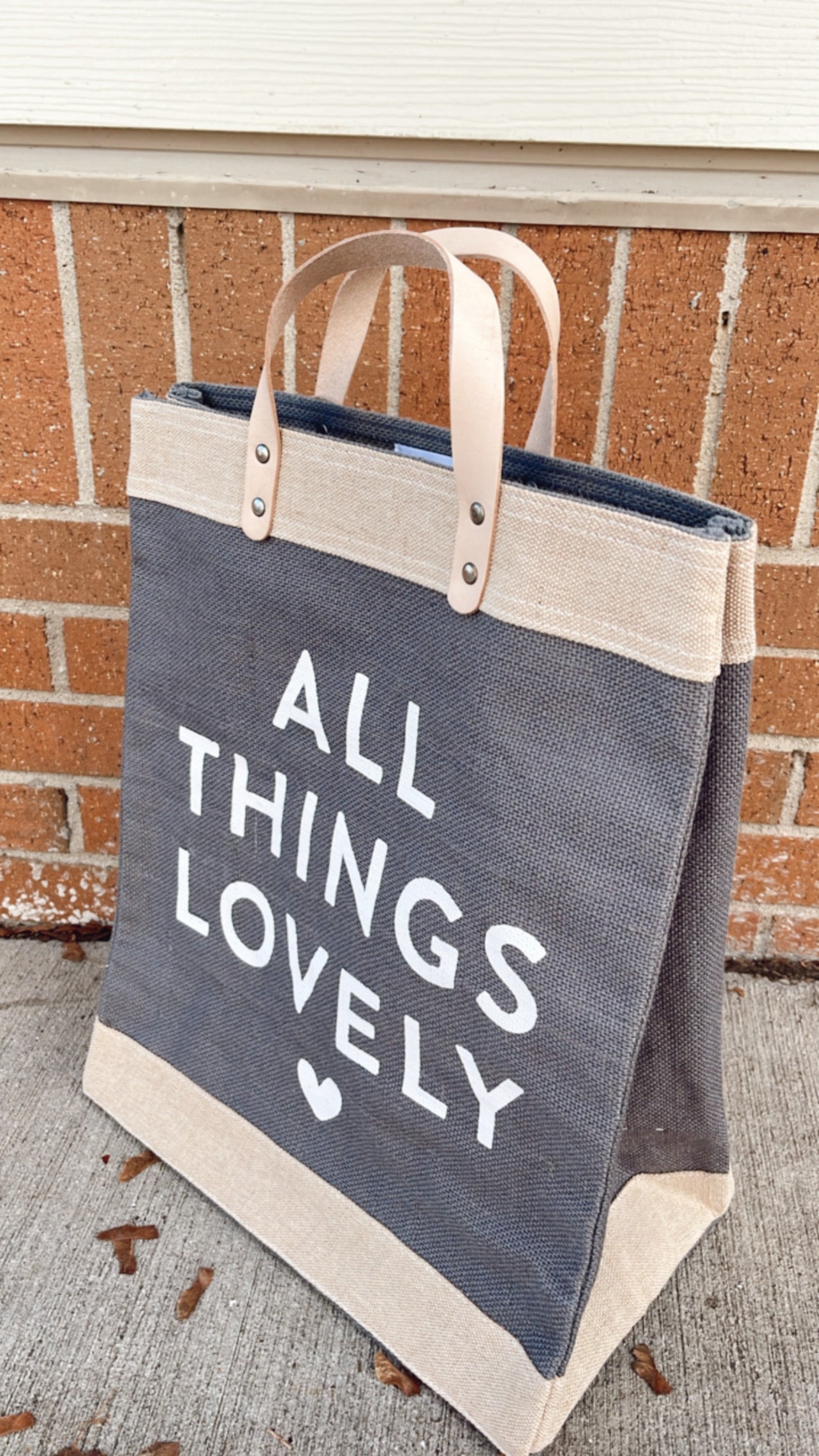 The All Thing Lovely tote is perfect for all your carrying needs. Whether you're shopping the farmers market, grabbing books from the library, or just need an "all the things" tote, this will be it.