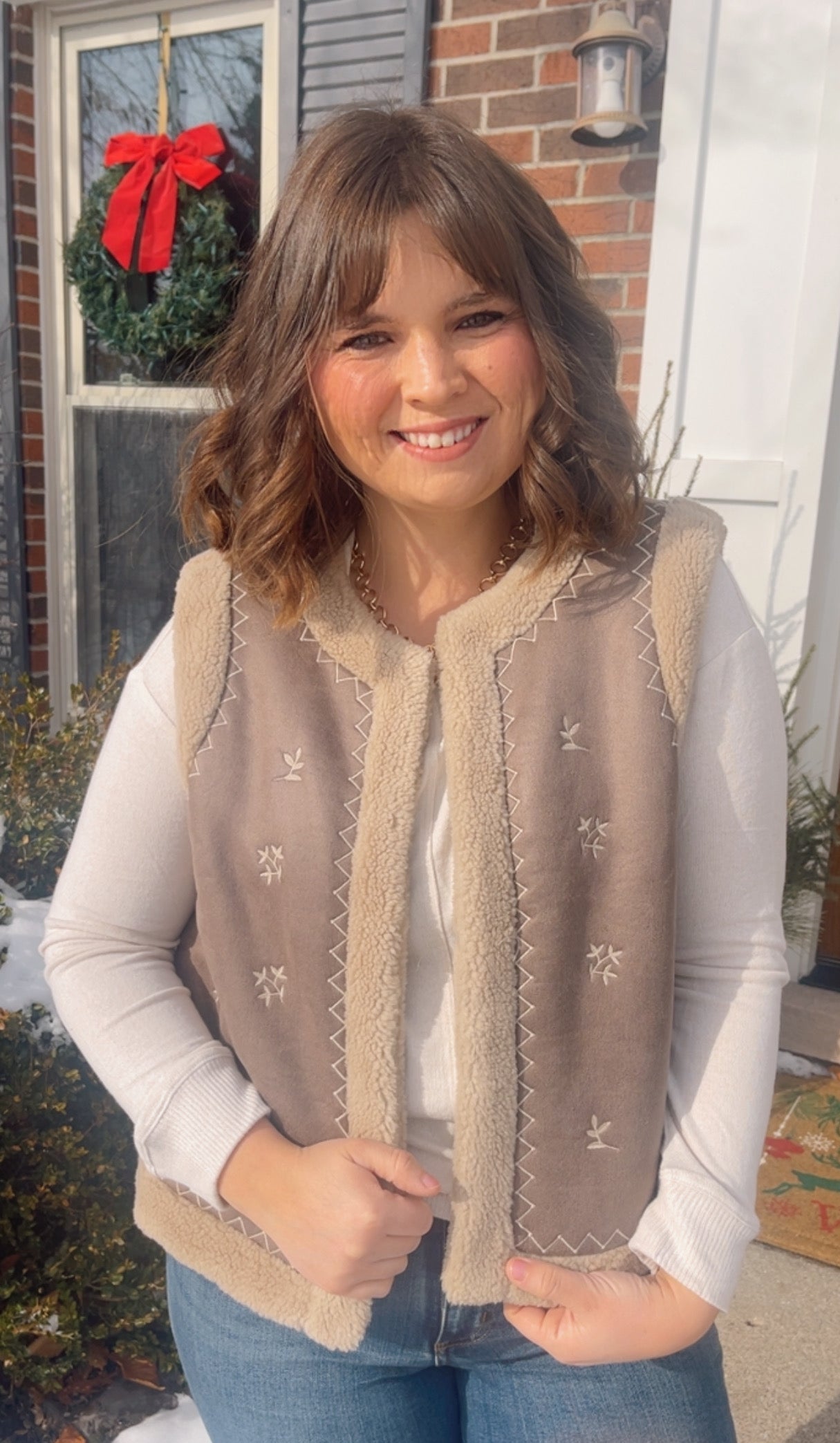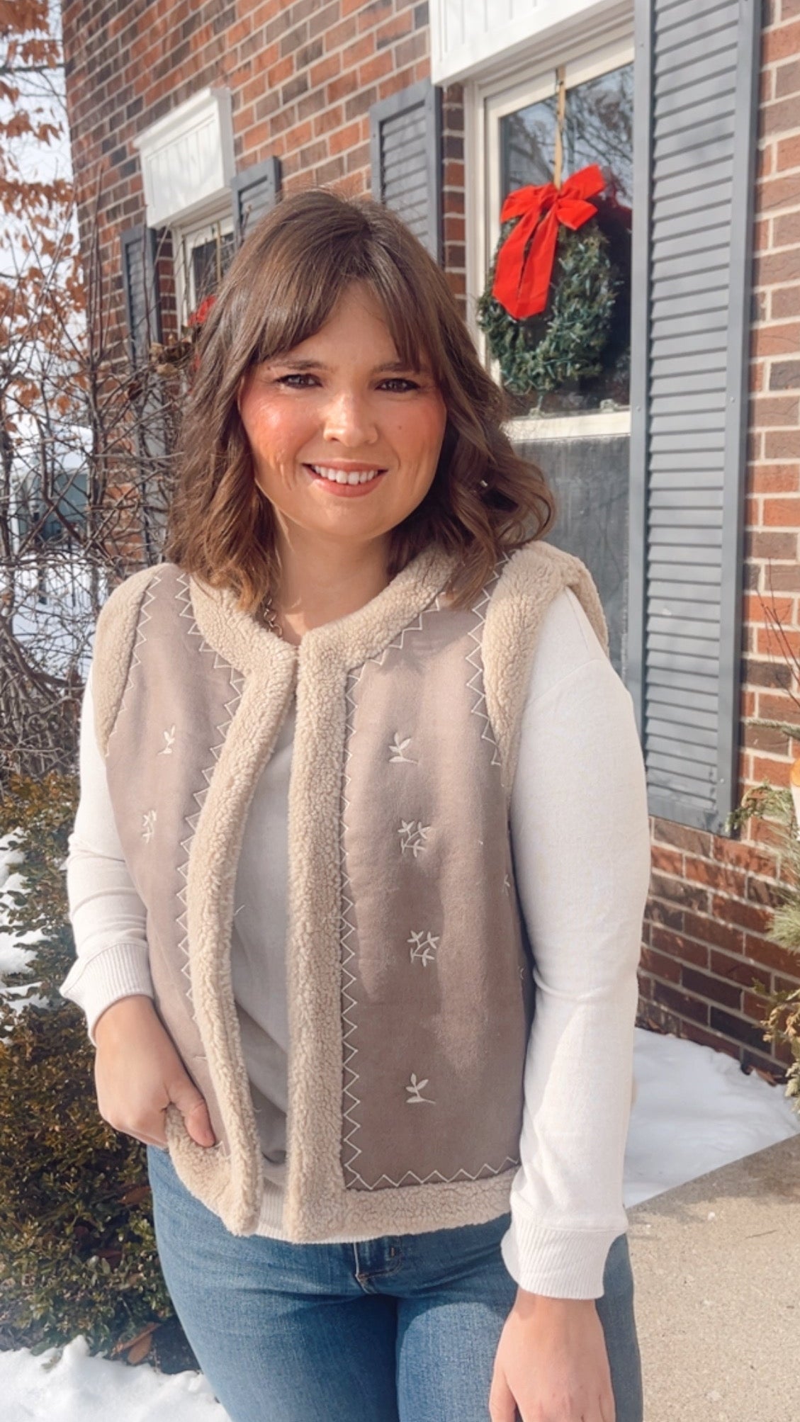 The Cabin Hearth Vest is a warm nod to rustic winter charm. With its soft faux suede shearling body and delicate embroidered details, it feels like a piece made for moments spent around a cabin fire—simple, sweet, and filled with comfort. Lightweight enough for layering yet warm enough to stand alone, it’s the perfect balance of practicality and seasonal charm.