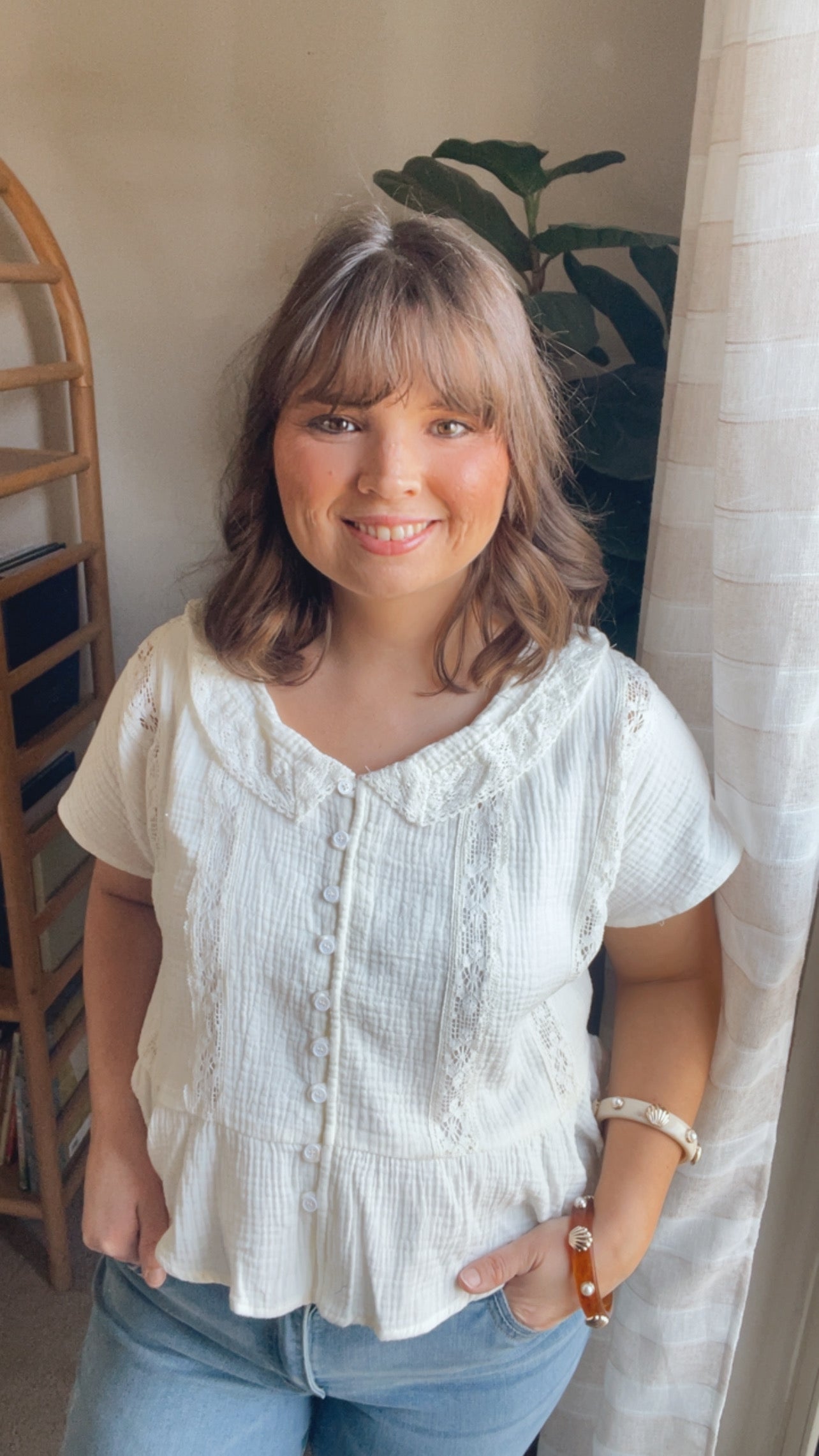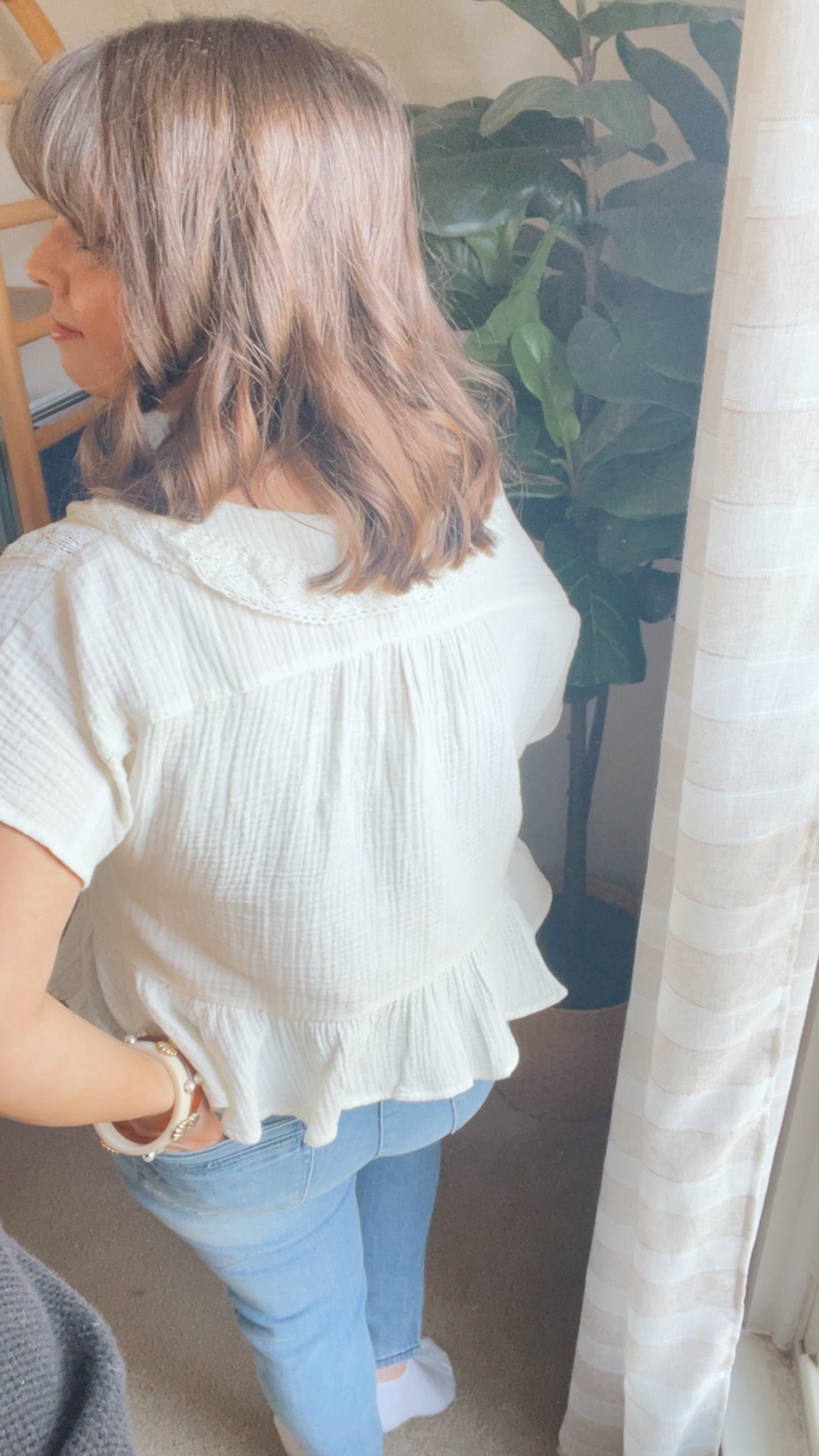 The Emma Cotton Gauze Blouse is a breezy pearl tone designed with soft breathable fabric and delicate feminine trim. Featuring a flattering peplum shape and effortless fit, this blouse feels timeless and easy for warm-weather dressing.