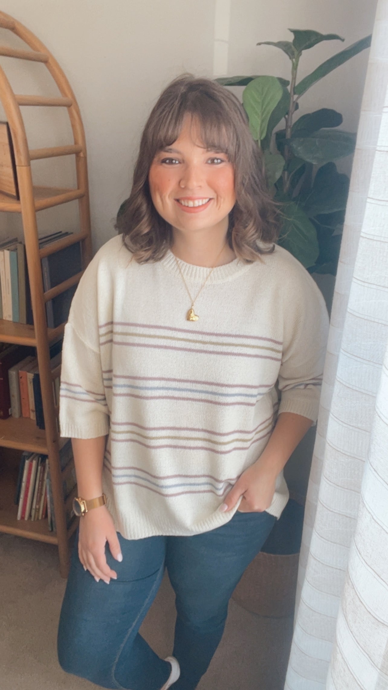 The Lavender Field Stripe Sweater is a soft, lightweight knit designed for the gentle shift between seasons. Featuring an ivory base with subtle lavender, sage, and blush stripes, this sweater brings quiet color and everyday ease to your spring wardrobe.