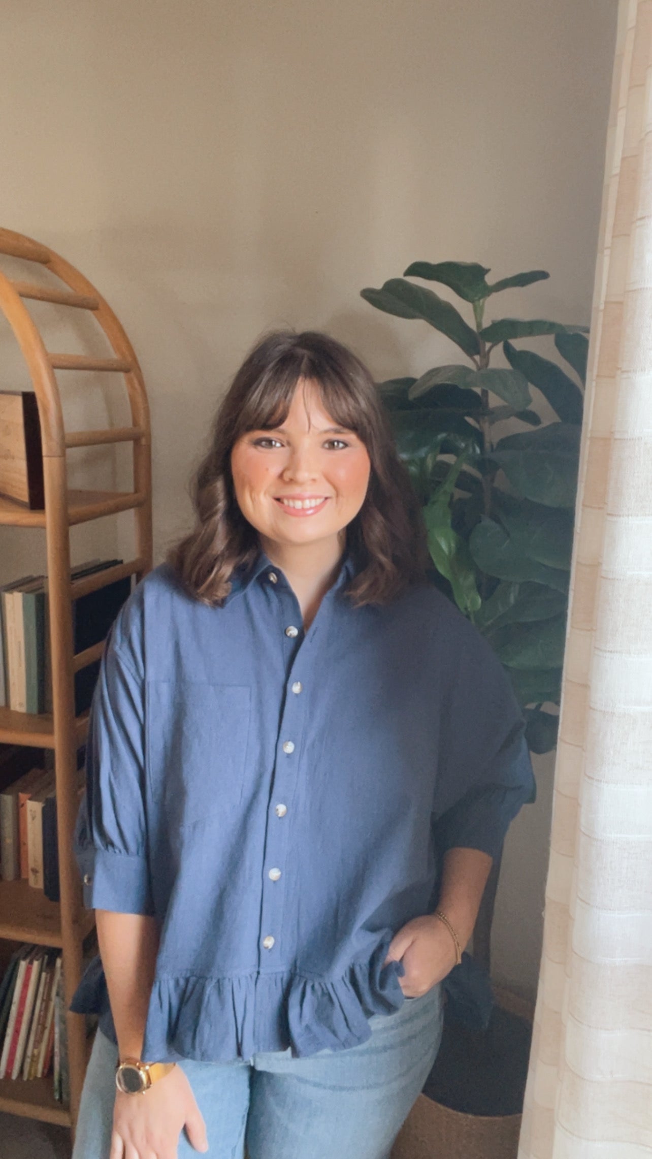 The Navy Button Down is a timeless blouse designed with a crisp drape, and feminine ruffle hem detailing. Elevated yet easy to wear, this classic top transitions beautifully from casual days to dressed-up moments.