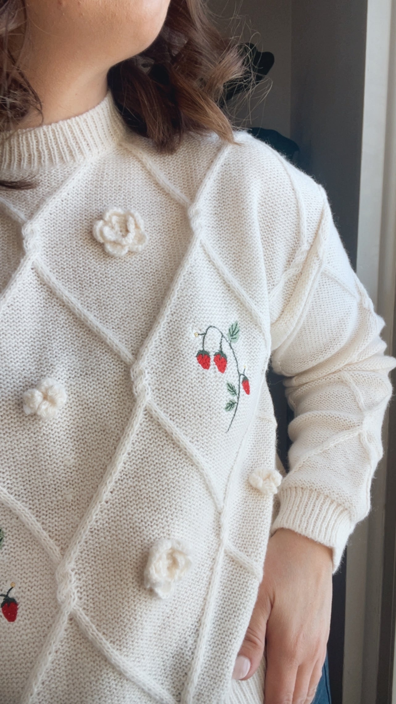 The Strawberries & Cream Sweater is a nostalgic favorite with delicate embroidered strawberry details on a soft ivory knit.