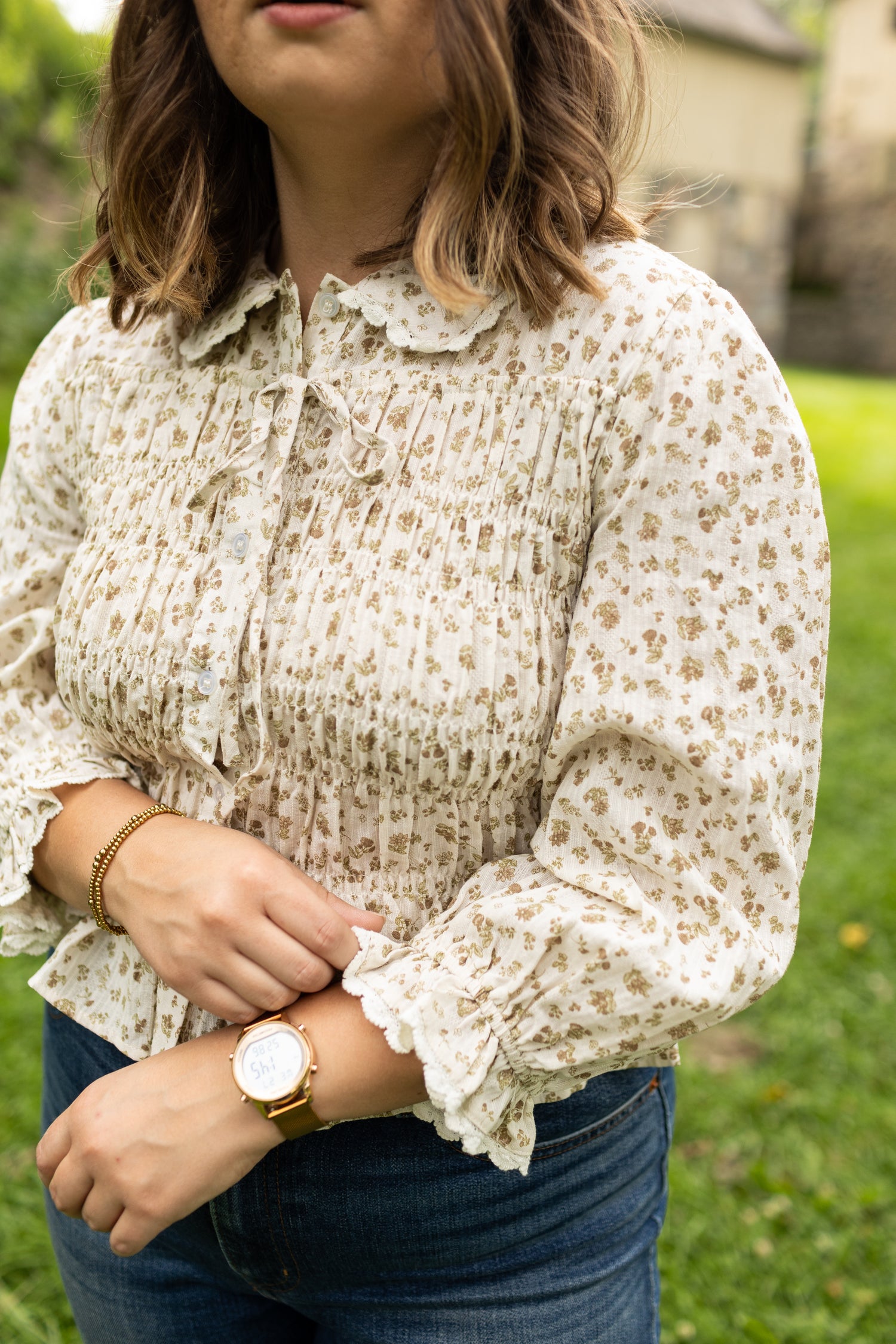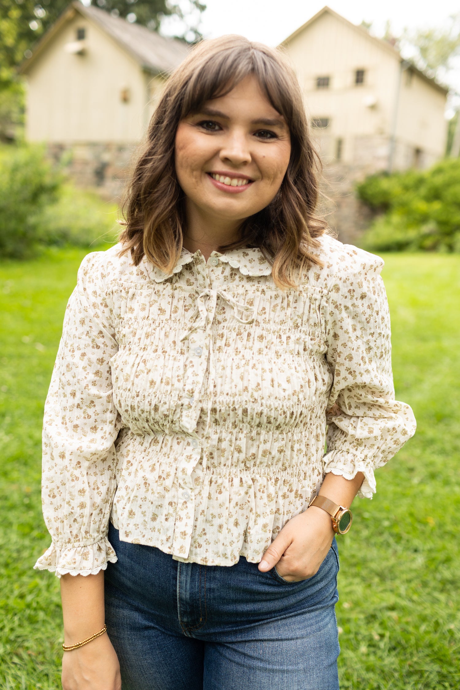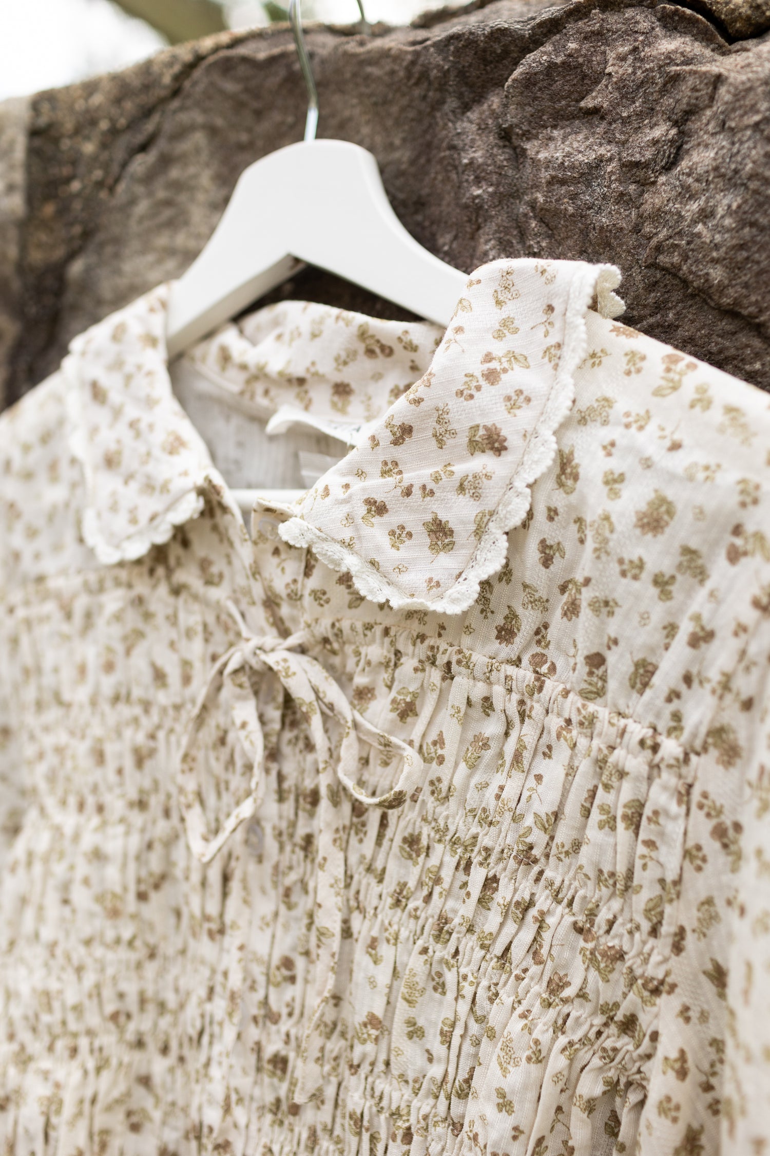 Romantic and refined, The Lillian Blouse feels like a love letter from times past. — Delicate floral smocking and a soft Peter Pan collar create a timeless silhouette. Feminine but wearable, it’s the kind of piece that makes everyday dressing feel like poetry.