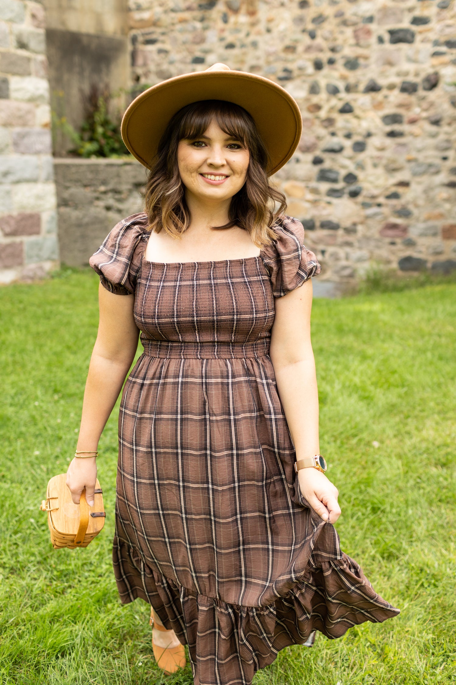 Step into the season with the kind of dress that feels like a warm afternoon in the countryside. The Maribel features a flattering smocked bodice, puff sleeves, and a full midi skirt made to move with you — whether you're strolling through farmers markets or sipping coffee on a cool morning. Its rich, vintage-inspired plaid pattern grounds this piece with just enough structure, while still remaining effortlessly feminine.
